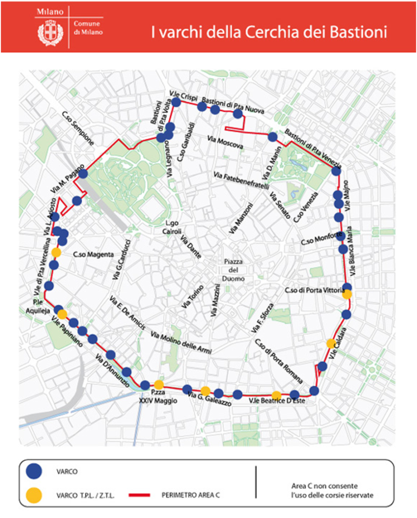 L’Area C corrisponde alla ZTL, Zona a traffico limitato, detta Cerchia dei Bastioni. È delimitata da 43 varchi elettronici muniti di telecamera, di cui 6 varchi dedicati al solo accesso per il trasporto pubblico e 1 varco dedicato solo ai muniti di permesso di accesso.